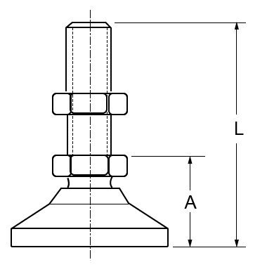 | Part No. | L (in) | A (in) | Base Dia. (in) | Thread | Pitch (mm) | Max. Height Adjustment (in) | Weight (lb) |
